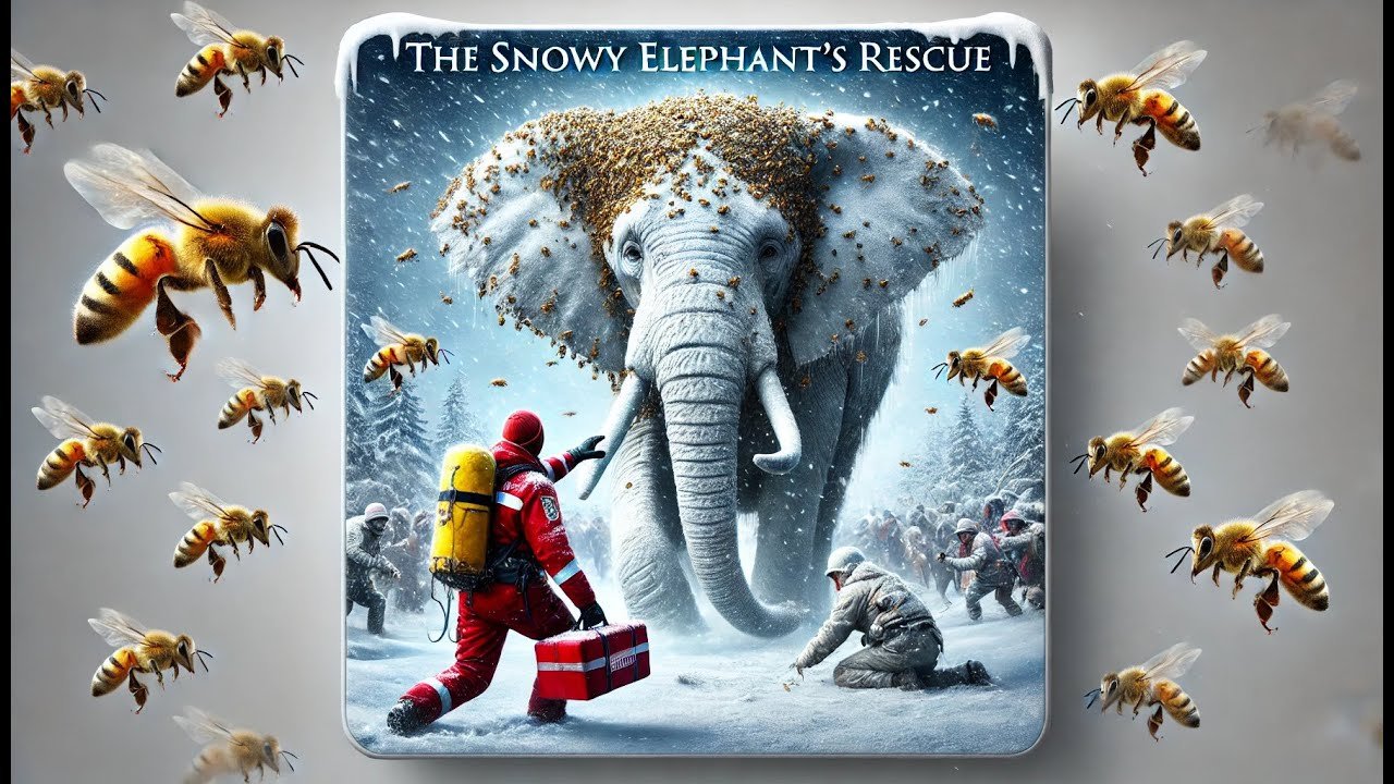 In the heart of a frozen jungle ❄️, a majestic white elephant lies helpless, its entire body swarmed by millions of honeybees .